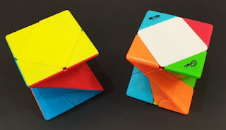 目前買的到的扭曲斜轉方塊有兩種版本, 上圖右是魔方格出品的扭曲斜轉方塊, 它是彩色的版本, 方塊的品質跟質感都相當不錯, 上圖左是泛新出品的扭曲斜轉方塊, 方塊定位功能很明顯, 轉起來也比較緊一些